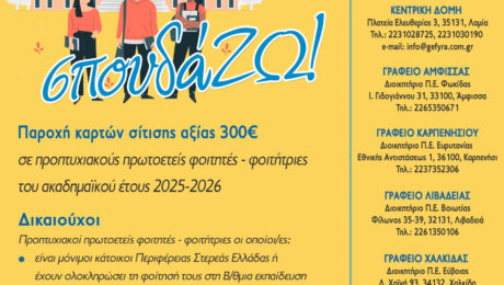 Tο Περιφερειακό Παρατηρητήριο Κοινωνικής Ένταξης Περιφέρειας Στερεάς Ελλάδας – Δομή «ΓΕΦΥΡΑ» υλοποιεί τη δράση «σπουδάΖΩ» που αφορά την παροχή καρτών σίτισης αξίας τριακοσίων ευρώ (300,00 €), εφάπαξ, σε προπτυχιακούς πρωτοετείς φοιτητές – φοιτήτριες του ακαδημαϊκού έτους 2024-2025, μέλη οικογενειών της Περιφέρειας Στερεάς Ελλάδας, με οικογενειακό εισόδημα κάτω από το όριο της φτώχειας, προσαυξανόμενο κατά χίλια ευρώ (1.000,00€).
